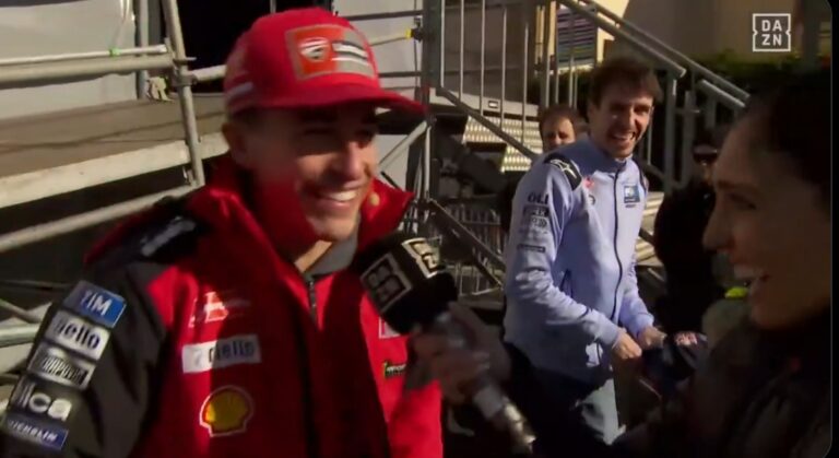 หลังจบการแข่งขันที่เต็มไปด้วยความกดดัน ขณะที่มาร์คกำลังให้สัมภาษณ์กับสื่อดังอย่าง DAZN ท่ามกลางบรรยากาศแห่งการเฉลิมฉลอง จู่ๆ เขาก็ทำท่าทางมีพิรุธ ก่อนจะตัดสินใจรูดซิปเสื้อแจ็คเก็ตทีมโรงงาน Ducati สีแดงเพลิงของเขาลง