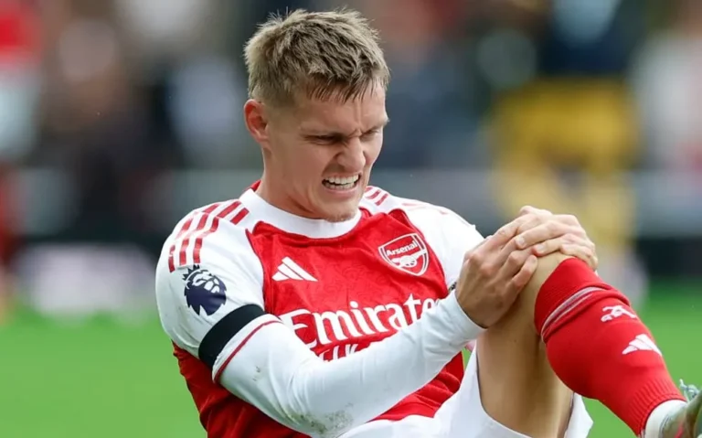 หลังจบเกม มีภาพโอเดการ์ดใส่เฝือกพยุงหัวเข่า ขณะที่ มิเกล อาร์เตต้า ยอมรับว่านักเตะ “รู้สึกไม่ดี” กับอาการบาดเจ็บที่เกิดขึ้น